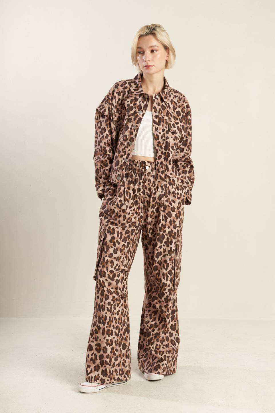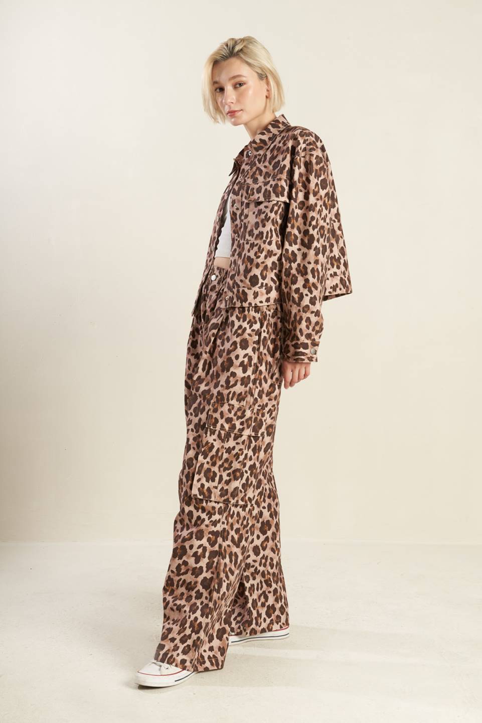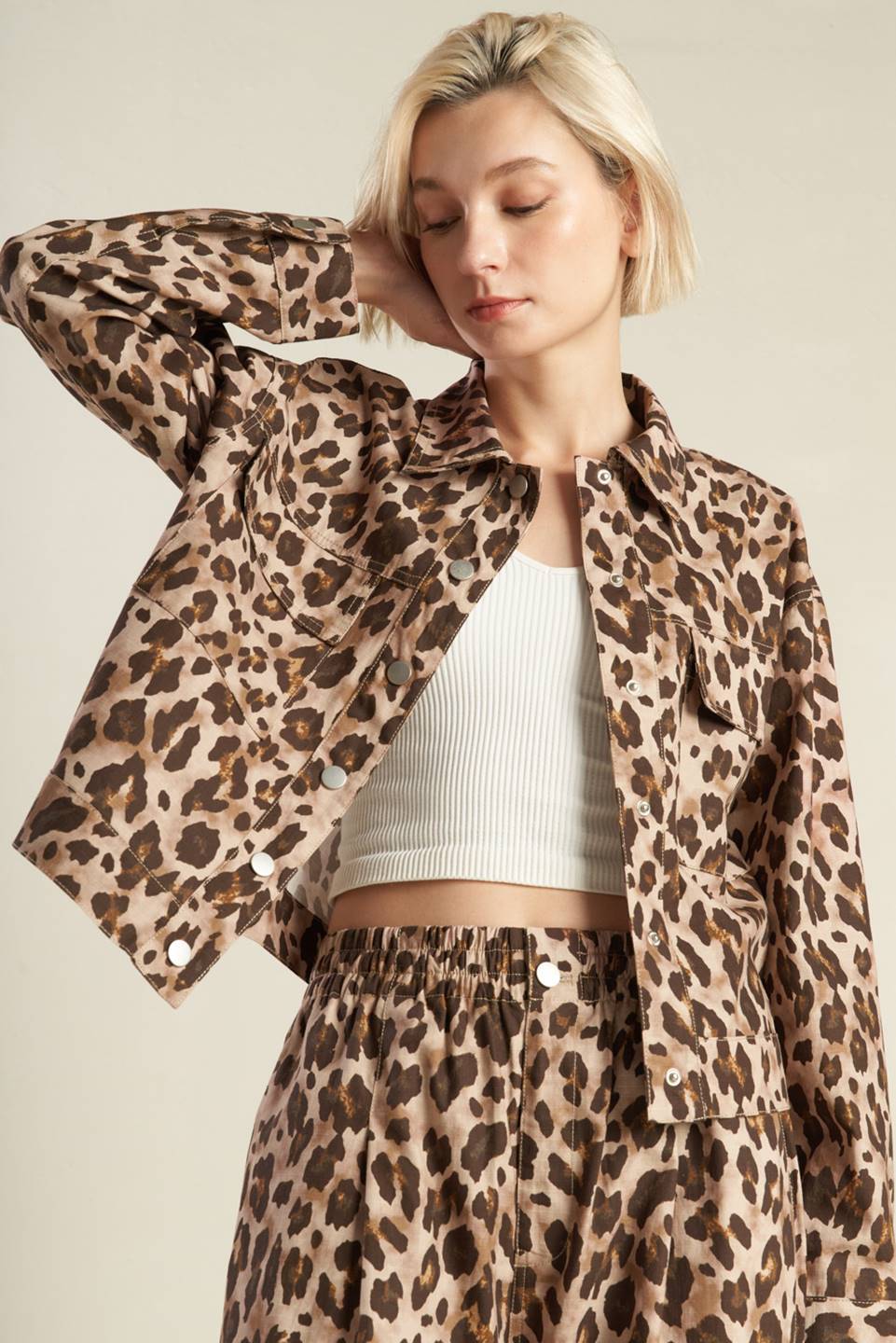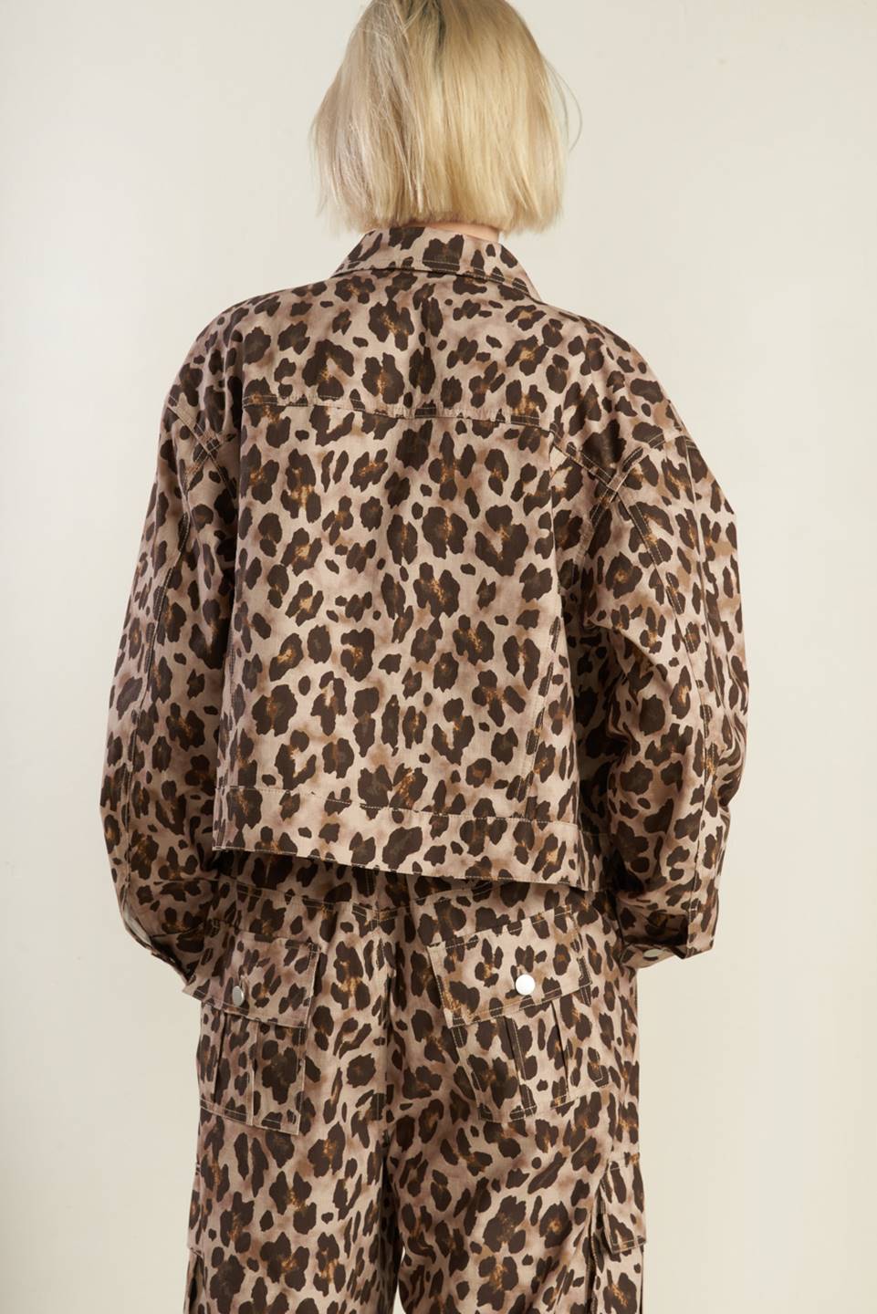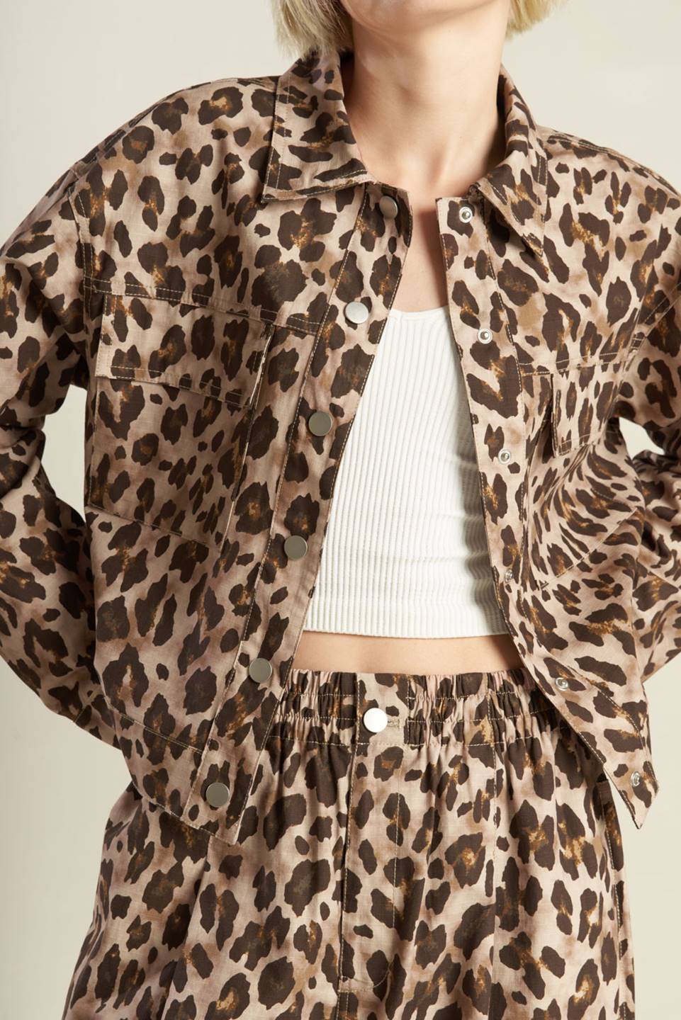 A printed woven jacket with front pockets and front closure. Matching pant FP1398