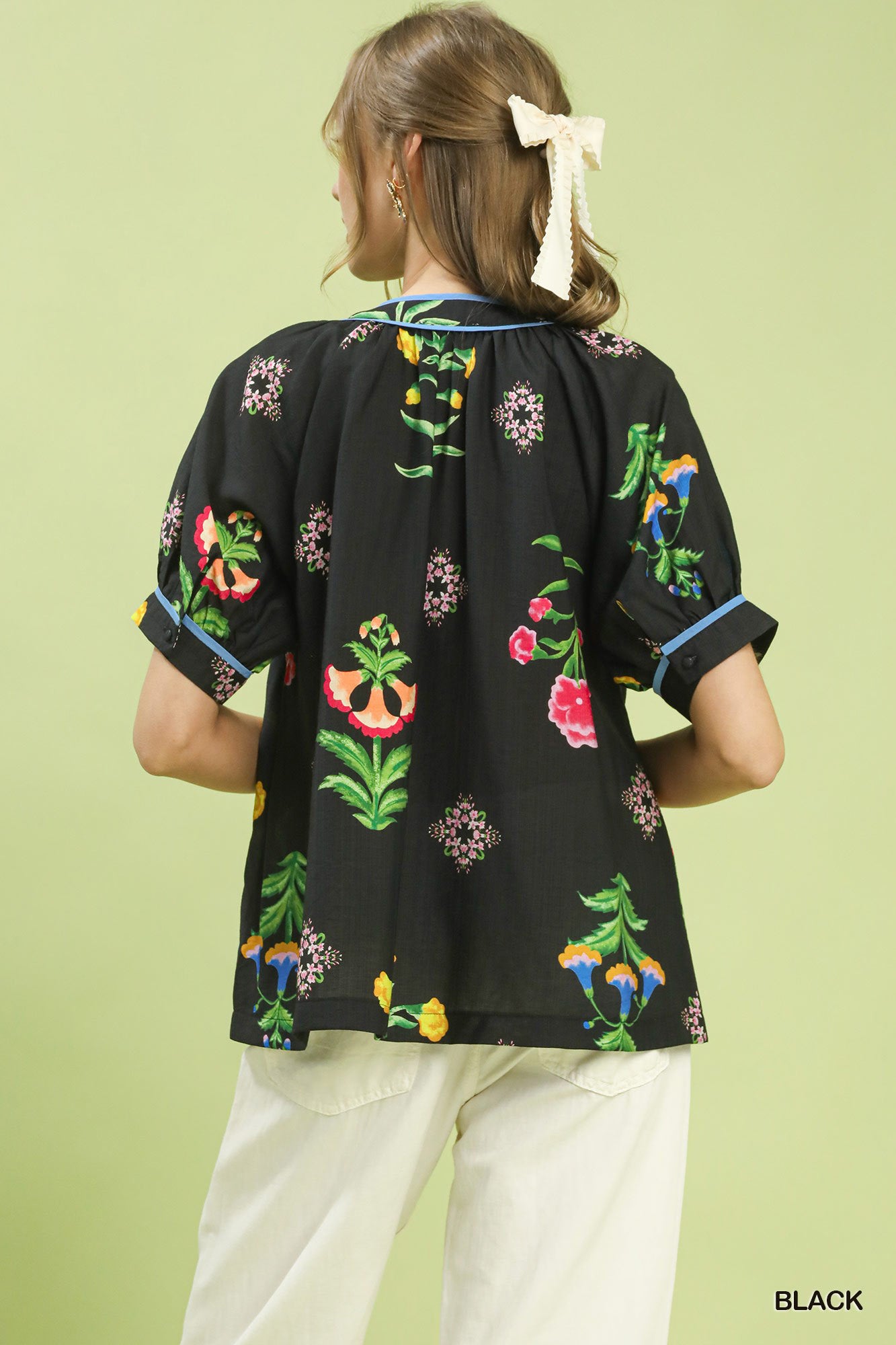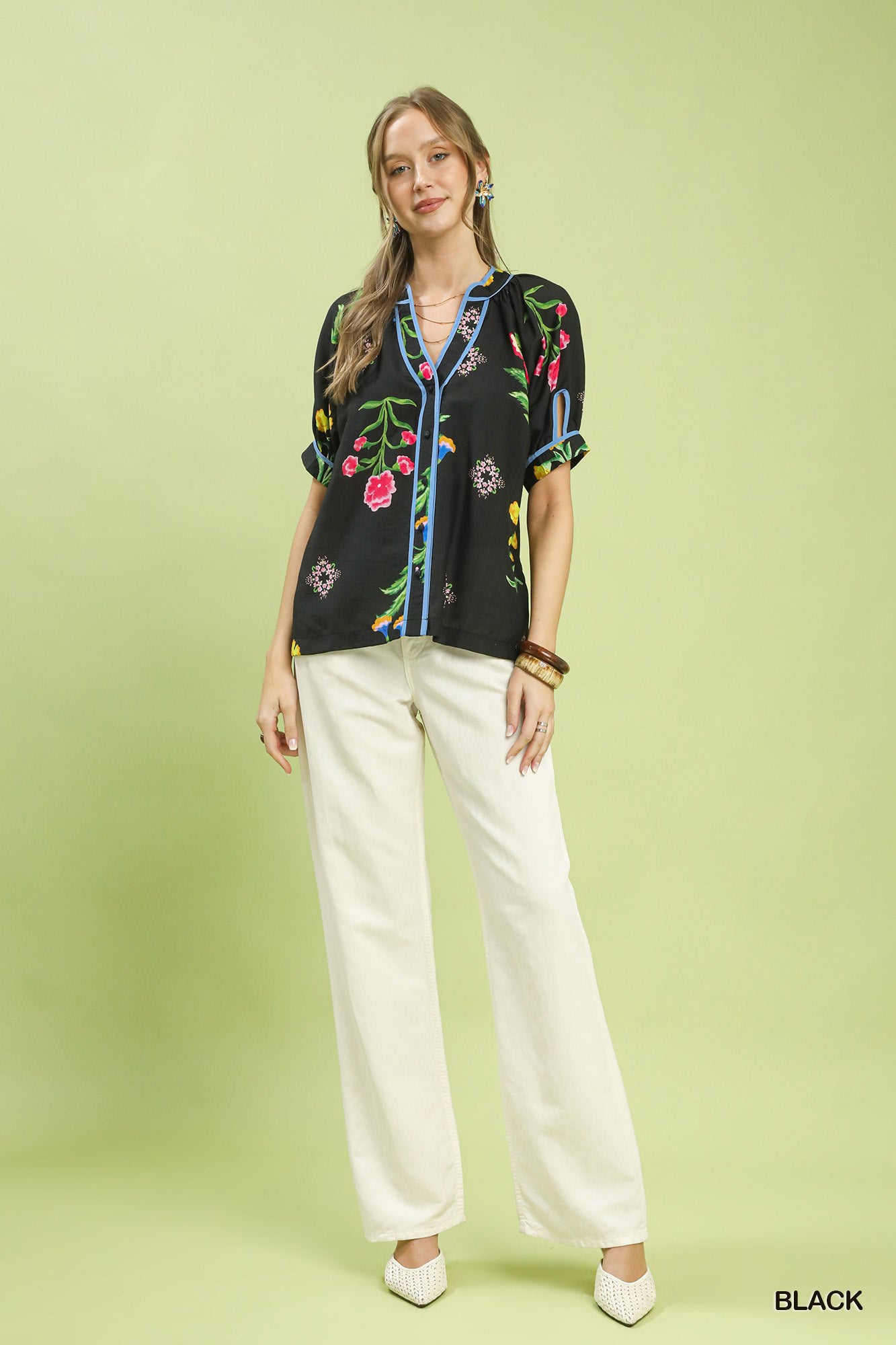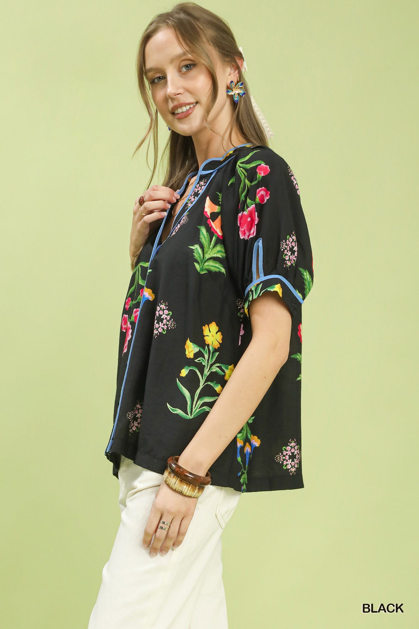 This Botanical Print Contrast Trim Button Blouse showcases a vibrant botanical floral print, accented with contrast blue trim along the neckline, placket and sleeves. It features a V‑notch collared neckline and short cuffed sleeves, with a button front design for easy wear. Unlined for a lightweight, breezy feel, it blends fresh botanical charm and refined contrast details into a versatile everyday blouse.