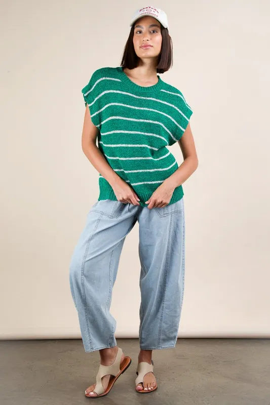 The Striped Knit Sweater Vest Top is a trendy and versatile addition to your wardrobe. Featuring a striped knit design, this sweater vest top offers a chic and stylish look. Perfect for layering over shirts or blouses, it adds a touch of texture and interest to your outfit. Pair it with jeans or trousers for a fashionable and polished ensemble.