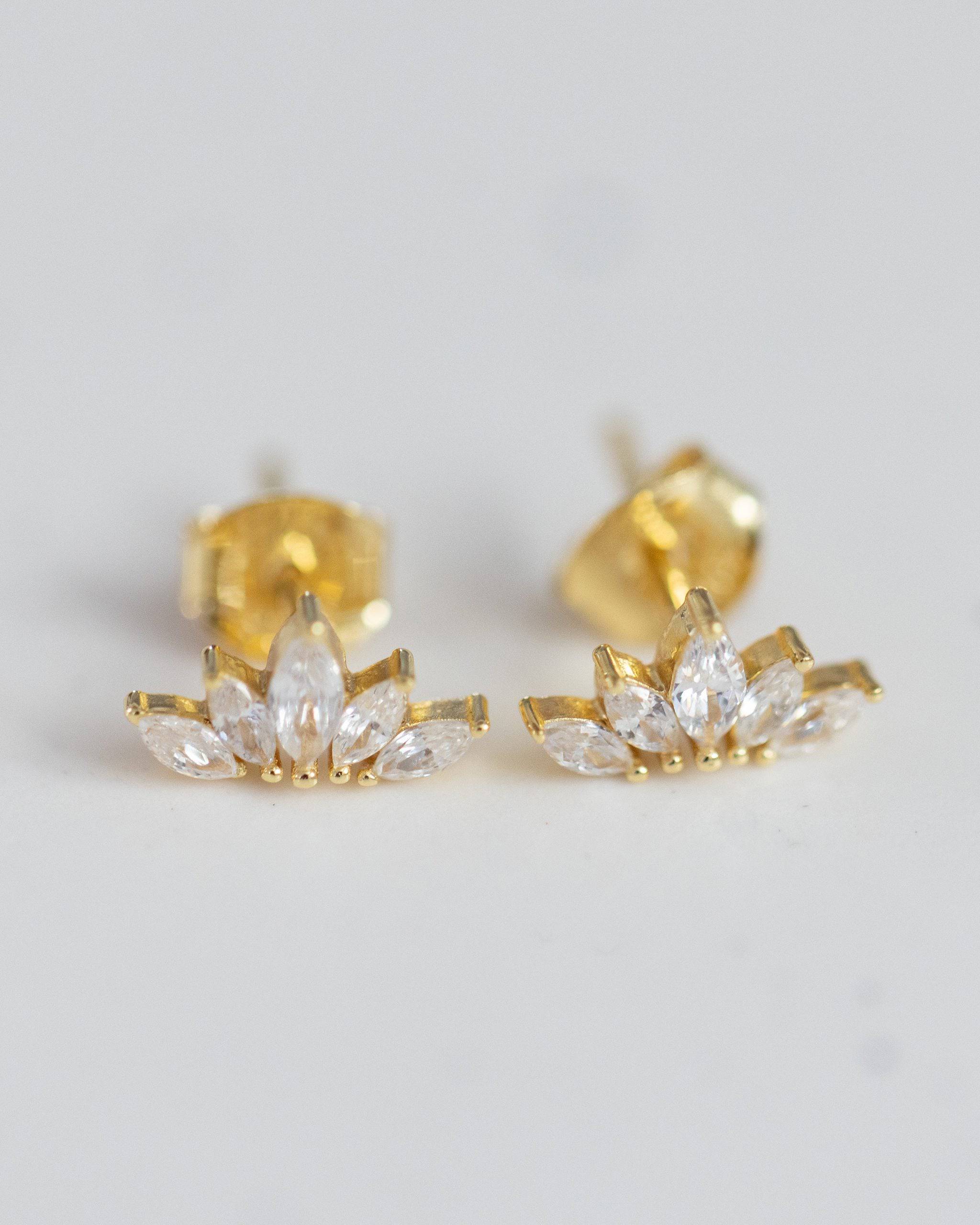 Bring a touch of elegance to any outfit with these Crystal Crown Studs. Crafted from gold vermeil and sparkling crystals, these studs provide a subtle yet sophisticated style.