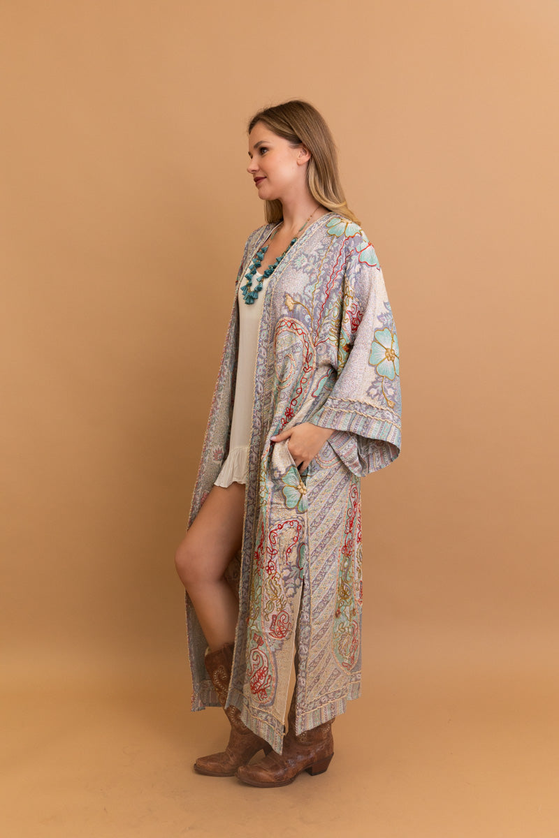 Elevate your style with our Paisley Blossom Stitch Kimono. The intricate stitching details add a fun and boho touch to this trendy piece. Perfect for any occasion, this kimono will make you stand out in style. #lovemyleto