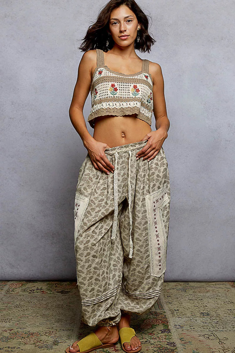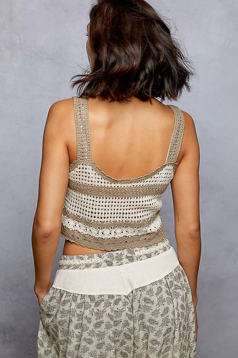 This scoop neck fitted cropped sleeveless top in crochet is a standout piece in any wardrobe. The see-through weave and color-blocked band point create a unique and eye-catching look. The floral embroidery adds a touch of femininity and charm to the design. The scalloped bottom opening detail adds a delicate and elegant finish to the top. With its solid color and normal washing care instructions, this top is a versatile and stylish addition to your collection.