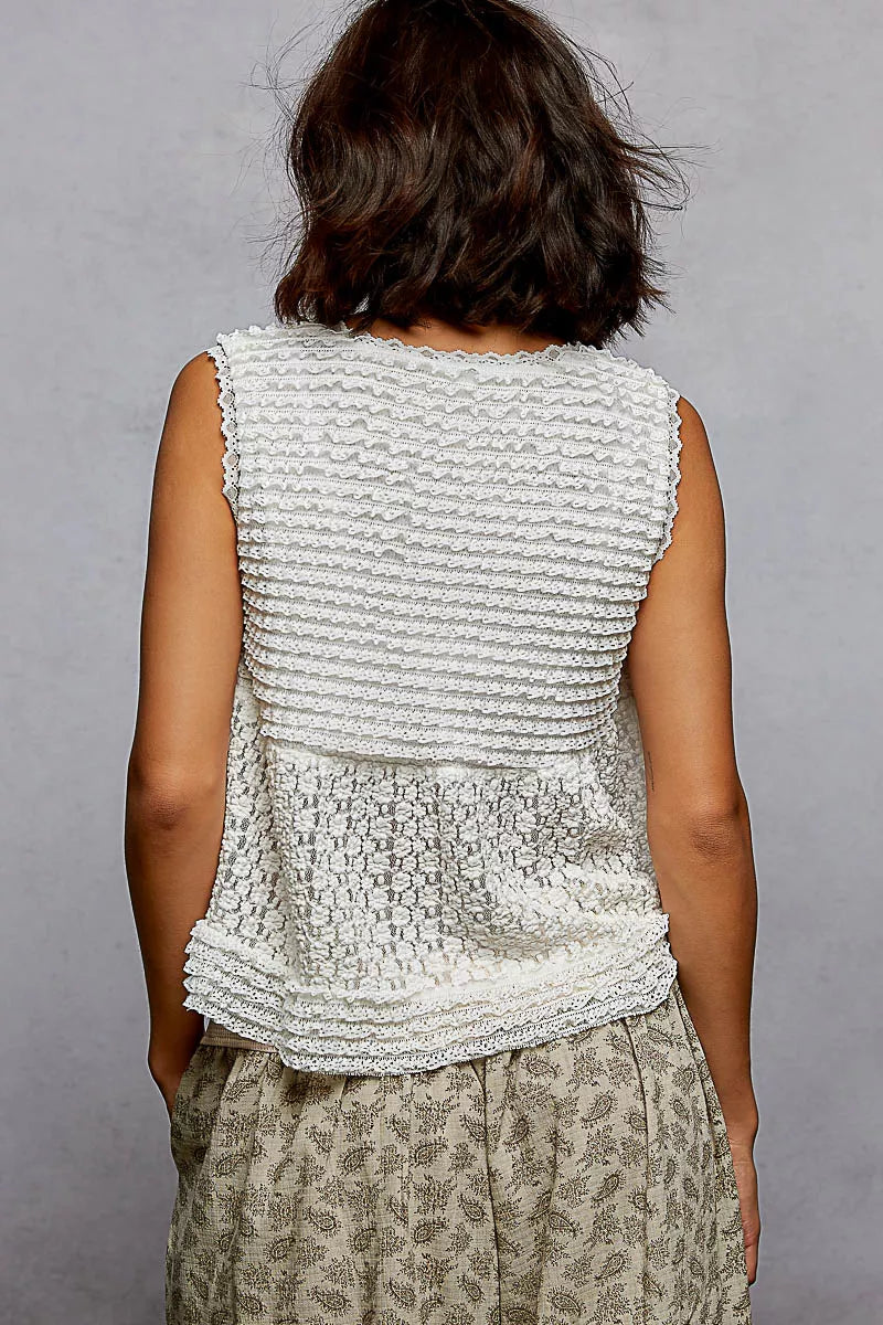 This V-neck top is sleeveless and features a cropped fit for a stylish look. Made from delicate lace fabric, it exudes elegance and femininity. The trim detail adds an extra touch of sophistication to the design. The pointed solid pattern enhances the overall aesthetic of the top. Pair it with high-waisted jeans or a skirt for a chic and trendy outfit.