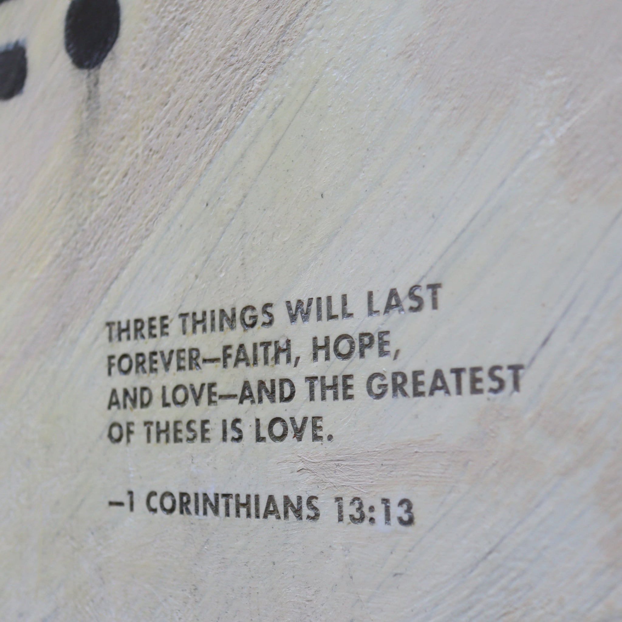 "Three things will last forever—faith, hope, and love—and the greatest of these is love." That's what it says at the end of 1 Corinthians 13, "the love chapter" of the NLT Bible—and we think it's a truth to hold on to, so we made this artwork to remind us to be patient, kind, and loving—to hold each other in high esteem, and to actively love one another every day.