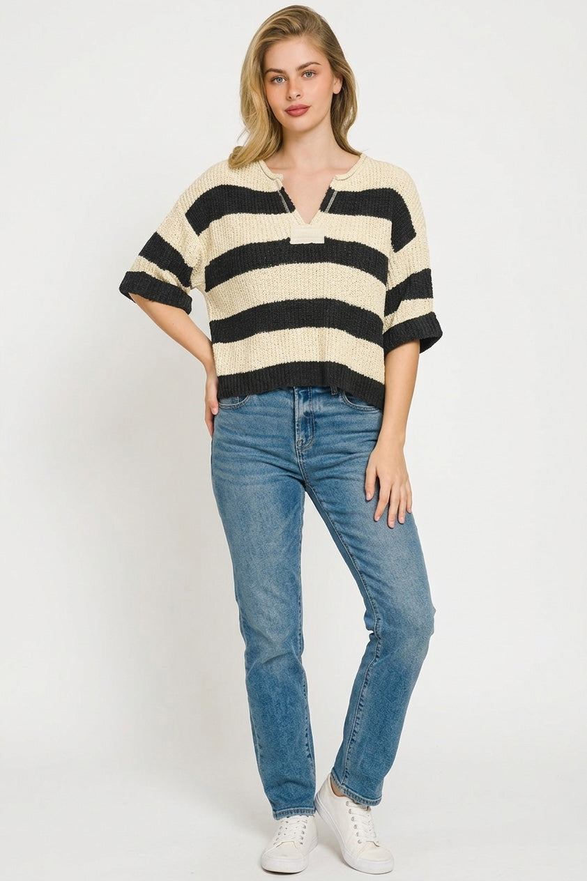 This Split Neck Stripe Sweater features a classic stripe pattern and a stylish split neck for a modern touch. It has a soft, lightweight knit that ensures cozy comfort for all-day wear. The relaxed fit offers a flattering silhouette and easy layering versatility. Clean finish details enhance its polished, casual appeal. Ideal for everyday styling, it pairs effortlessly with jeans, pants, or skirts.